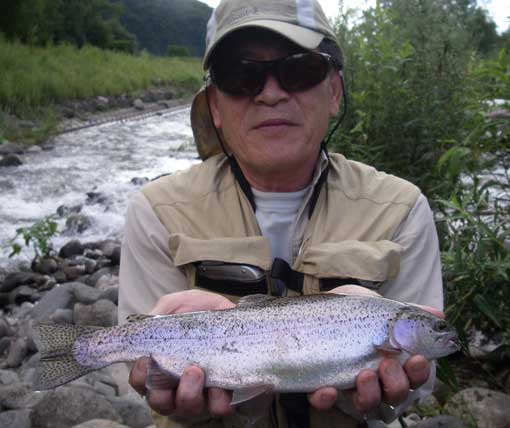 「大木! フライとは、こんなもんよ!」って言いながらも、こんな鱒がスクール中にヒット出来るこの川の凄さ、この場所を指定した、名ガイドの凄さに感激しました!