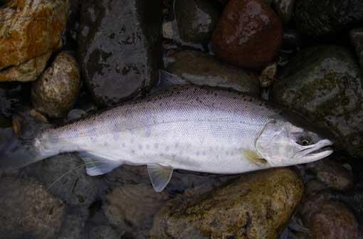 鱒を岩裏のしら泡に入れ