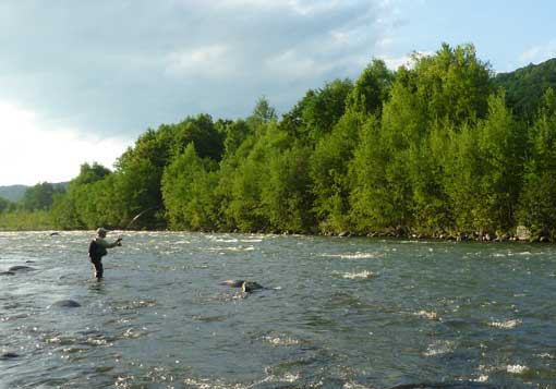 上流からテンションを掛け続けたら、鱒はどんどん下って行き、下流にある激流に入ってしまう事間違いないのです。